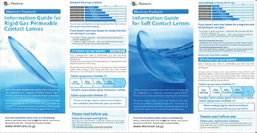 CL協会やメーカー各社からの情報提供用資料も活用され、特に初めてコンタクトレンズを使用するお客様にご自宅でも読んで確認いただけるようお渡しされています。