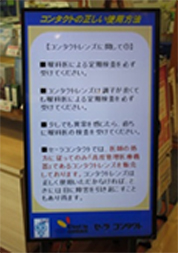 来店のお客様へは、快適なコンタクトレンズを安心、快適に使用して頂けるようPOPを店内に掲載して必ず説明をされています。また、CL協会販売自主基準に基づく販売方法を徹底されています。