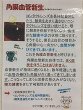 コンタクトレンズの誤装用等での眼障害やコンタクトレンズの素材とその関連製品について、手作りPOPを作成しています。店内の目立つ場所に掲示し、定期検査喚起につなげています。
